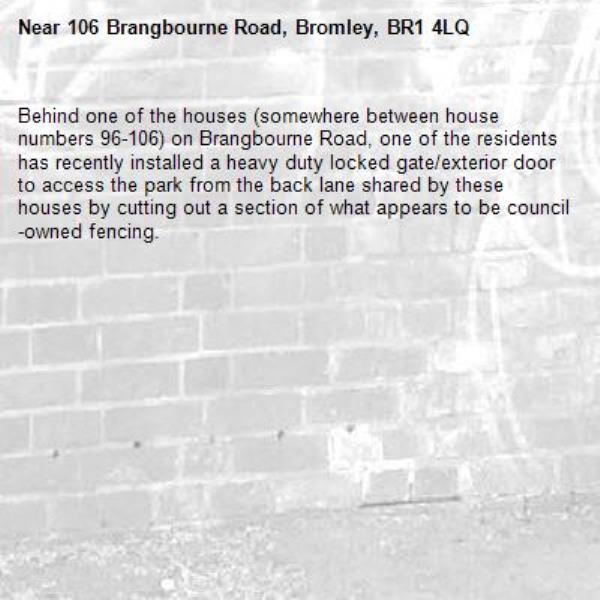 Behind one of the houses (somewhere between house numbers 96-106) on Brangbourne Road, one of the residents has recently installed a heavy duty locked gate/exterior door to access the park from the back lane shared by these houses by cutting out a section of what appears to be council-owned fencing.