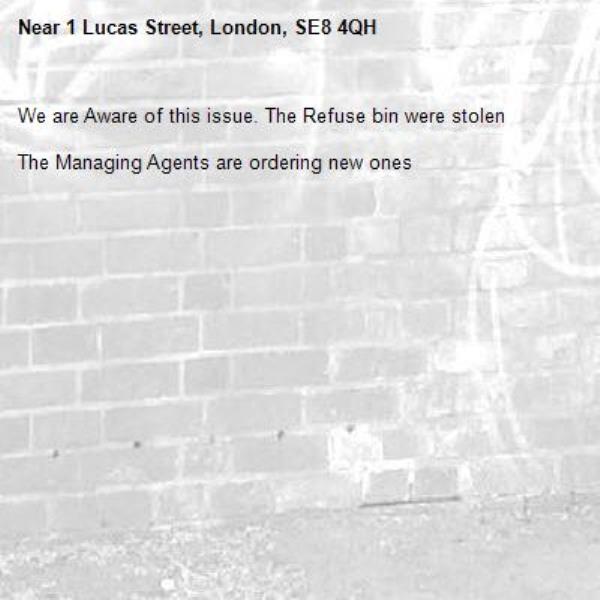 We are Aware of this issue. The Refuse bin were stolen The Managing Agents are ordering new ones
