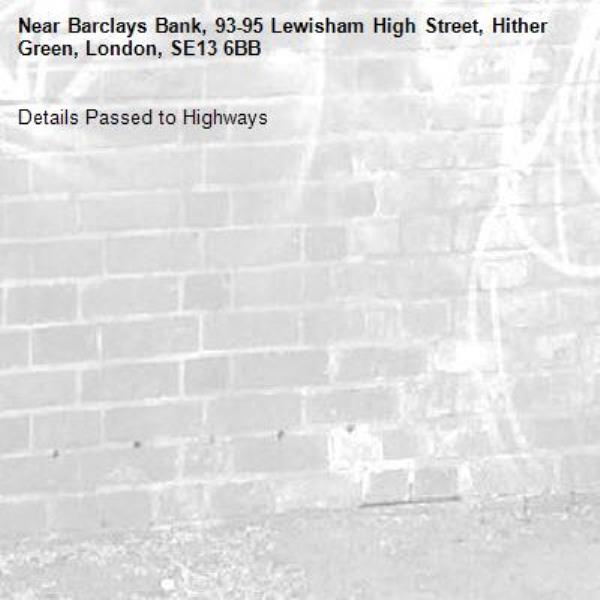 Details Passed to Highways-Barclays Bank, 93-95 Lewisham High Street, Hither Green, London, SE13 6BB 10/02/2026 16:35 Details Passed to Highways
