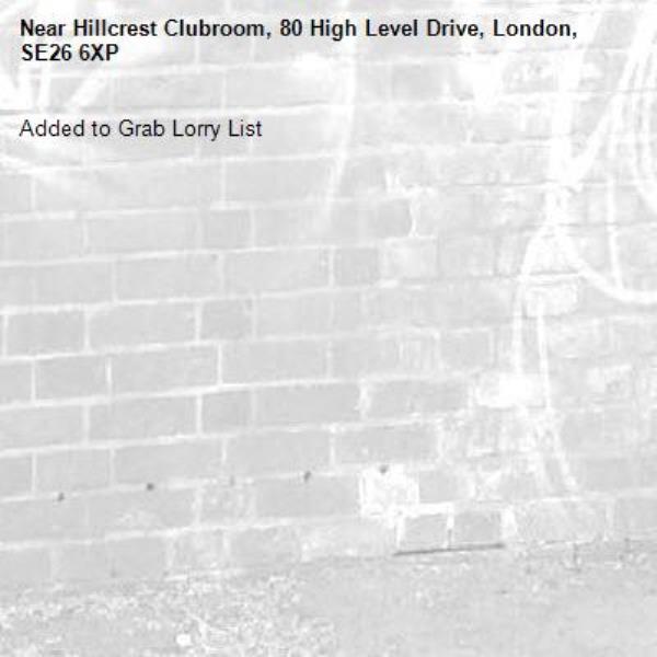 Added to Grab Lorry List -Hillcrest Clubroom, 80 High Level Drive, London, SE26 6XP 11/12/2025 09:26 Added to Grab Lorry List