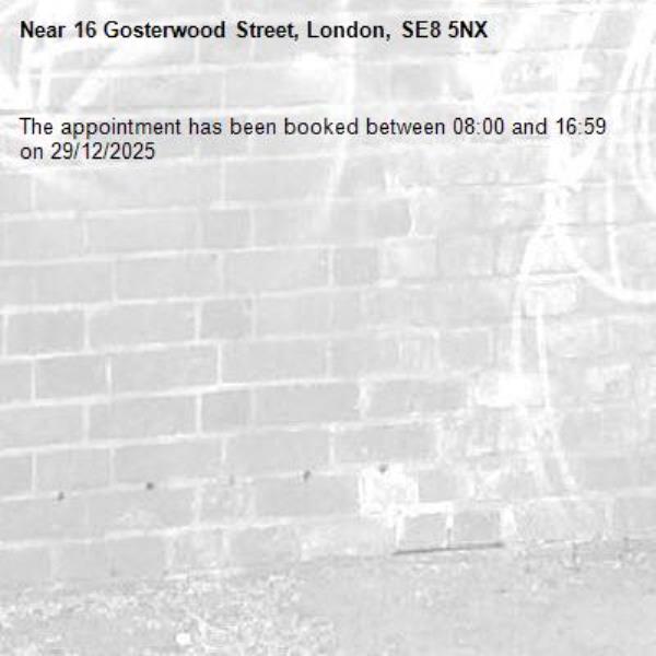 The appointment has been booked between 08:00 and 16:59 on 29/12/2025