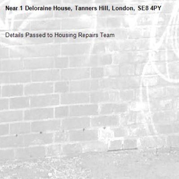 Details Passed to Housing Repairs Team-1 Deloraine House, Tanners Hill, London, SE8 4PY 09/04/2026 14:29 Details Passed to Housing Repairs Team