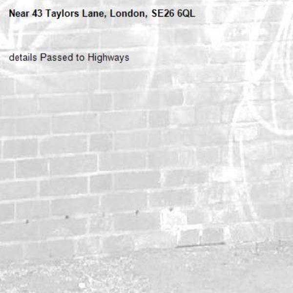 details Passed to Highways-43 Taylors Lane, London, SE26 6QL 27/01/2026 13:58 details Passed to Highways