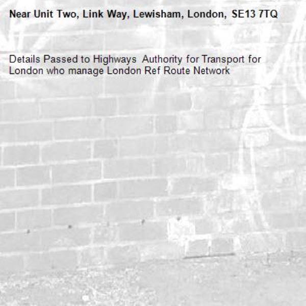 Details Passed to Highways  Authority for Transport for London who manage London Ref Route Network-Unit Two, Link Way, Lewisham, London, SE13 7TQ 20/10/2025 16:58 Details Passed to Highways Authority for Transport for London who manage London Ref Route Network