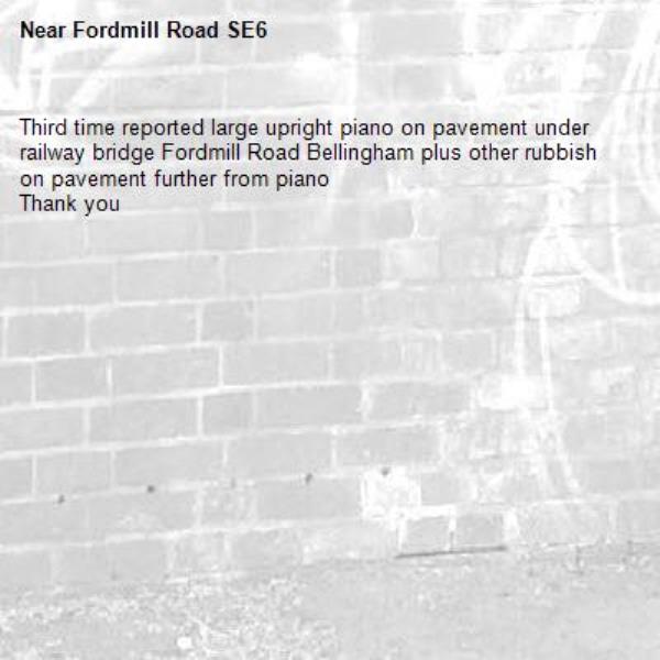 Third time reported large upright piano on pavement under railway bridge Fordmill Road Bellingham plus other rubbish on pavement further from piano<br/>Thank you