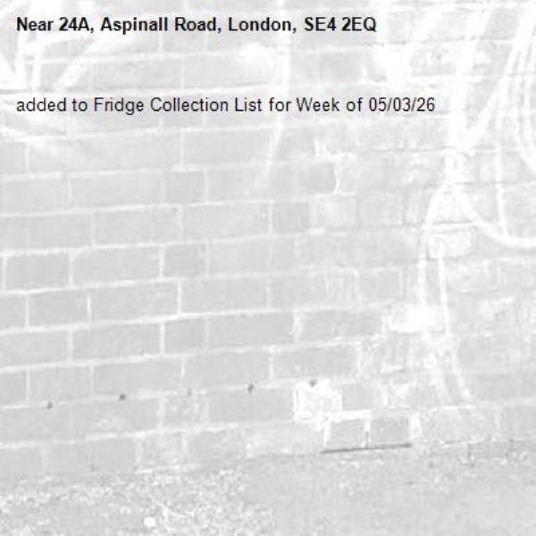 added to Fridge Collection List for Week of 05/03/26-24A, Aspinall Road, London, SE4 2EQ 25/02/2026 13:40 added to Fridge Collection List for Week of 05/03/26