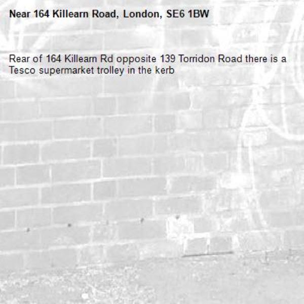 Rear of 164 Killearn Rd opposite 139 Torridon Road there is a Tesco supermarket trolley in the kerb