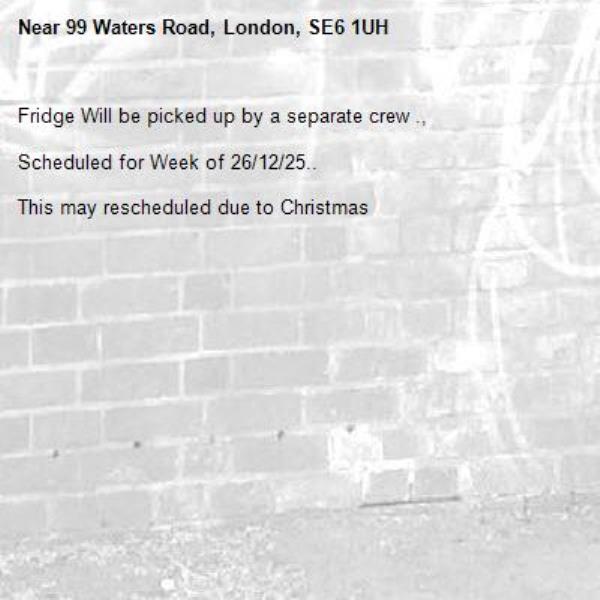 This may rescheduled due to Christmas-99 Waters Road, London, SE6 1UH 17/12/2025 08:54 Fridge Will be picked up by a separate crew .,