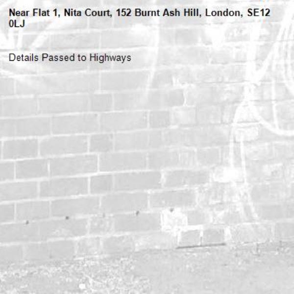 Details Passed to Highways-Flat 1, Nita Court, 152 Burnt Ash Hill, London, SE12 0LJ 10/04/2026 15:03 Details Passed to Highways