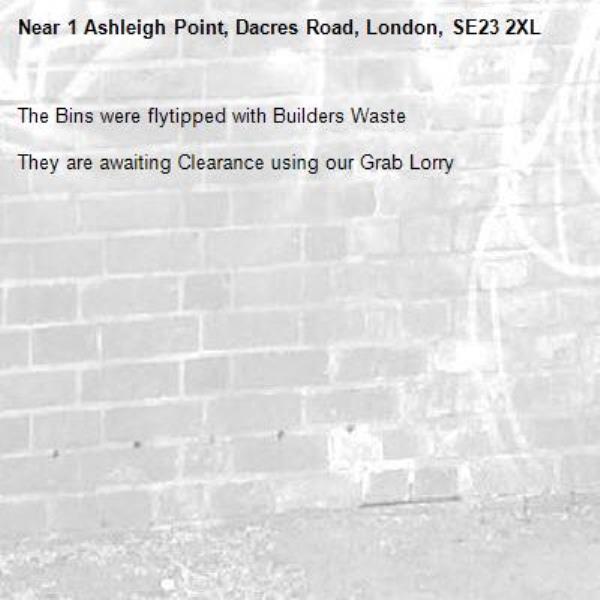 They are awaiting Clearance using our Grab Lorry-1 Ashleigh Point, Dacres Road, London, SE23 2XL 20/01/2026 11:58 The Bins were flytipped with Builders Waste They are awaiting Clearance using our Grab Lorry