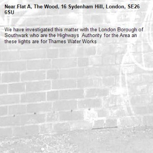 We have investigated this matter with the London Borough of Southwark who are the Highways  Authority for the Area an these lights are for Thames Water Works-Flat A, The Wood, 16 Sydenham Hill, London, SE26 6SU 20/10/2025 16:51 We have investigated this matter with the London Borough of Southwark who are the Highways Authority for the Area an these lights are for Thames Water Works