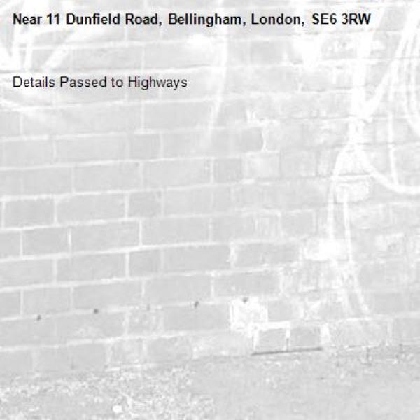 Details Passed to Highways-11 Dunfield Road, Bellingham, London, SE6 3RW 11/03/2026 15:33 Details Passed to Highways