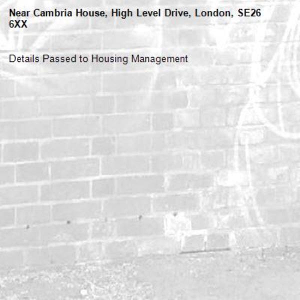 Details Passed to Housing Management-Cambria House, High Level Drive, London, SE26 6XX 23/01/2026 11:21 Details Passed to Housing Management
