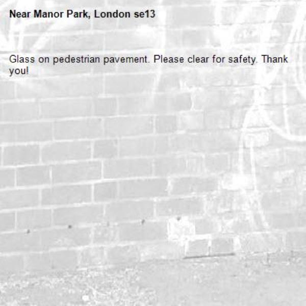 Glass on pedestrian pavement. Please clear for safety. Thank you!