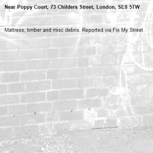 Mattress, timber and misc debris. Reported via Fix My Street