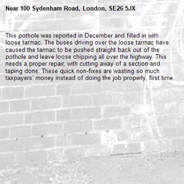 This pothole was reported in December and filled in with loose tarmac. The buses driving over the loose tarmac have caused the tarmac to be pushed straight back out of the pothole and leave loose chipping all over the highway. This needs a proper repair, with cutting away of a section and taping done. These quick non-fixes are wasting so much taxpayers’ money instead of doing the job properly, first time.