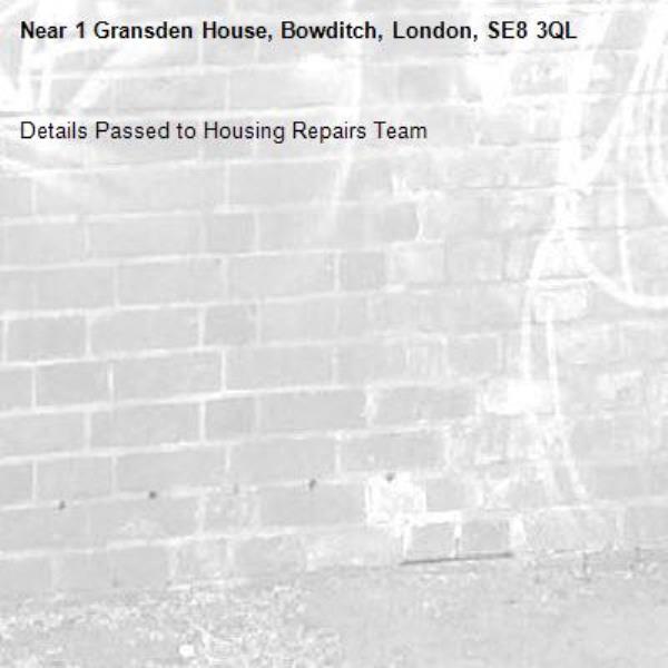 Details Passed to Housing Repairs Team-1 Gransden House, Bowditch, London, SE8 3QL 18/02/2026 12:01 Details Passed to Housing Repairs Team