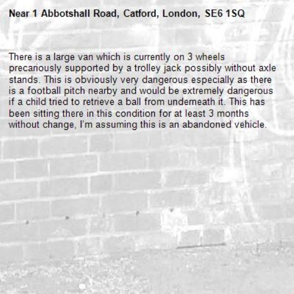 There is a large van which is currently on 3 wheels precariously supported by a trolley jack possibly without axle stands. This is obviously very dangerous especially as there is a football pitch nearby and would be extremely dangerous if a child tried to retrieve a ball from underneath it. This has been sitting there in this condition for at least 3 months without change, I’m assuming this is an abandoned vehicle.-1 Abbotshall Road, Catford, London, SE6 1SQ