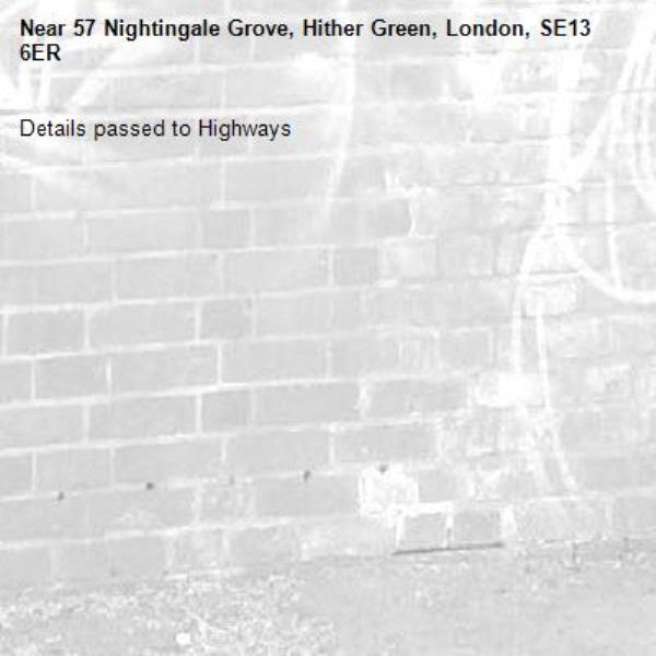 Details passed to Highways-57 Nightingale Grove, Hither Green, London, SE13 6ER 13/10/2025 10:28 Details passed to Highways