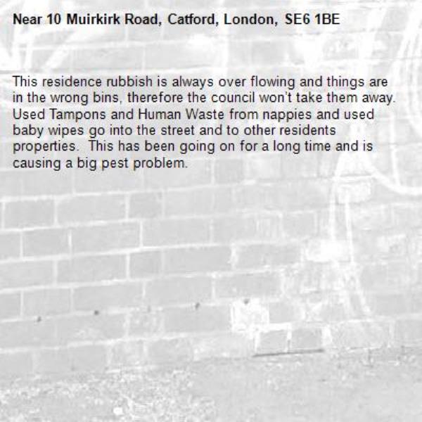 This residence rubbish is always over flowing and things are in the wrong bins, therefore the council won’t take them away. Used Tampons and Human Waste from nappies and used baby wipes go into the street and to other residents properties. This has been going on for a long time and is causing a big pest problem.