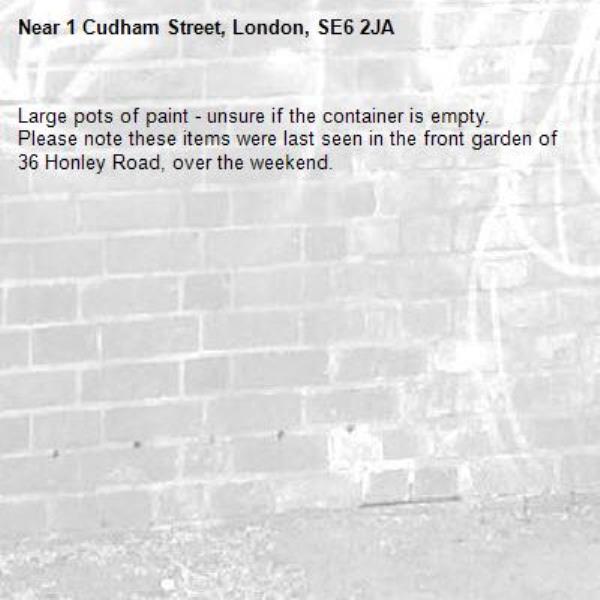 Large pots of paint - unsure if the container is empty. Please note these items were last seen in the front garden of 36 Honley Road, over the weekend.