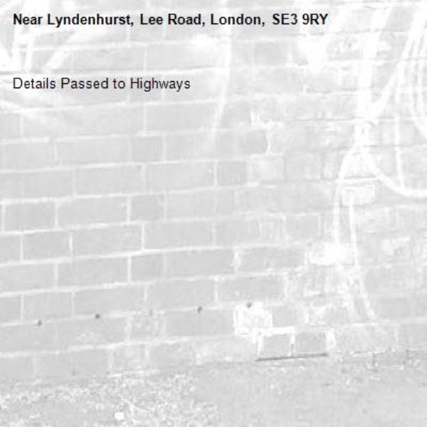 Details Passed to Highways-Lyndenhurst, Lee Road, London, SE3 9RY 10/02/2026 10:40 Details Passed to Highways