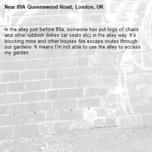 In the alley just before 89a, someone has put logs of chairs and other rubbish (bikes car seats etc) in the alley way. It’s blocking mine and other houses fire escape routes through our gardens. It means I’m not able to use the alley to access my garden