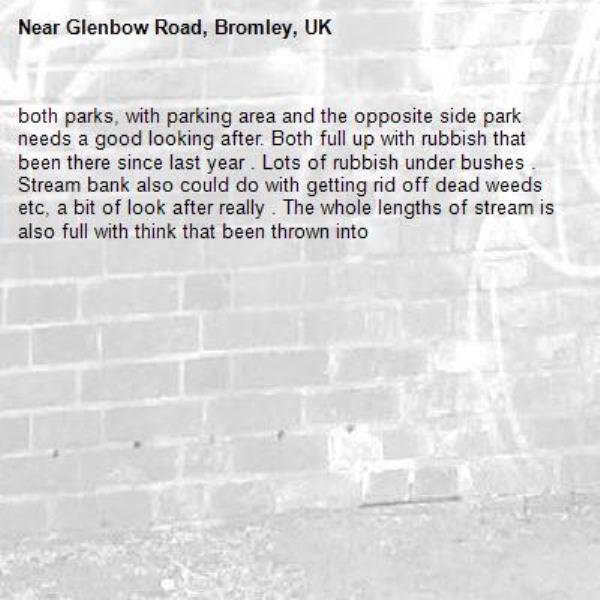 both parks, with parking area and the opposite side park needs a good looking after. Both full up with rubbish that been there since last year . Lots of rubbish under bushes . Stream bank also could do with getting rid off dead weeds etc, a bit of look after really . The whole lengths of stream is also full with think that been thrown into -Glenbow Road, Bromley, UK
