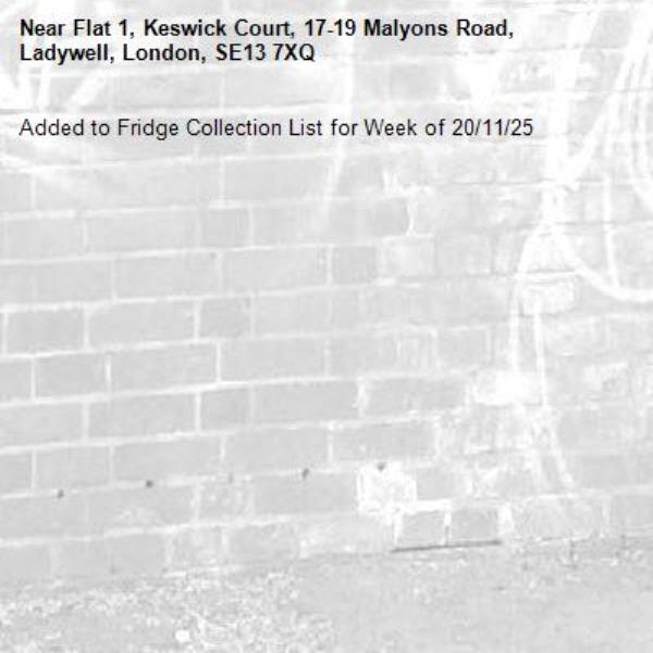 Added to Fridge Collection List for Week of 20/11/25-Flat 1, Keswick Court, 17-19 Malyons Road, Ladywell, London, SE13 7XQ 13/11/2025 15:41 Added to Fridge Collection List for Week of 20/11/25