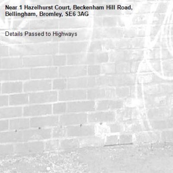 Details Passed to Highways-1 Hazelhurst Court, Beckenham Hill Road, Bellingham, Bromley, SE6 3AG 13/10/2025 09:14 Details Passed to Highways